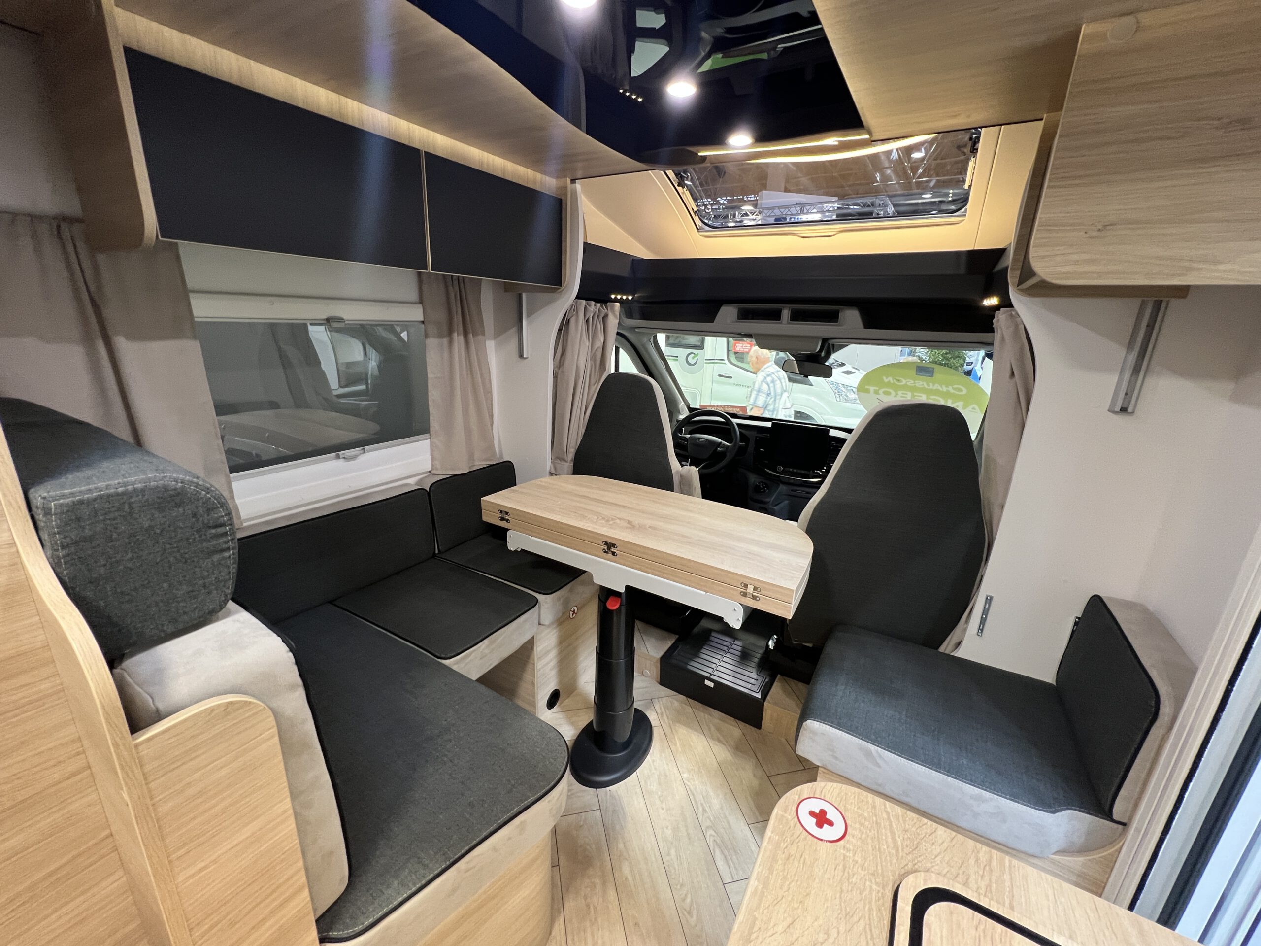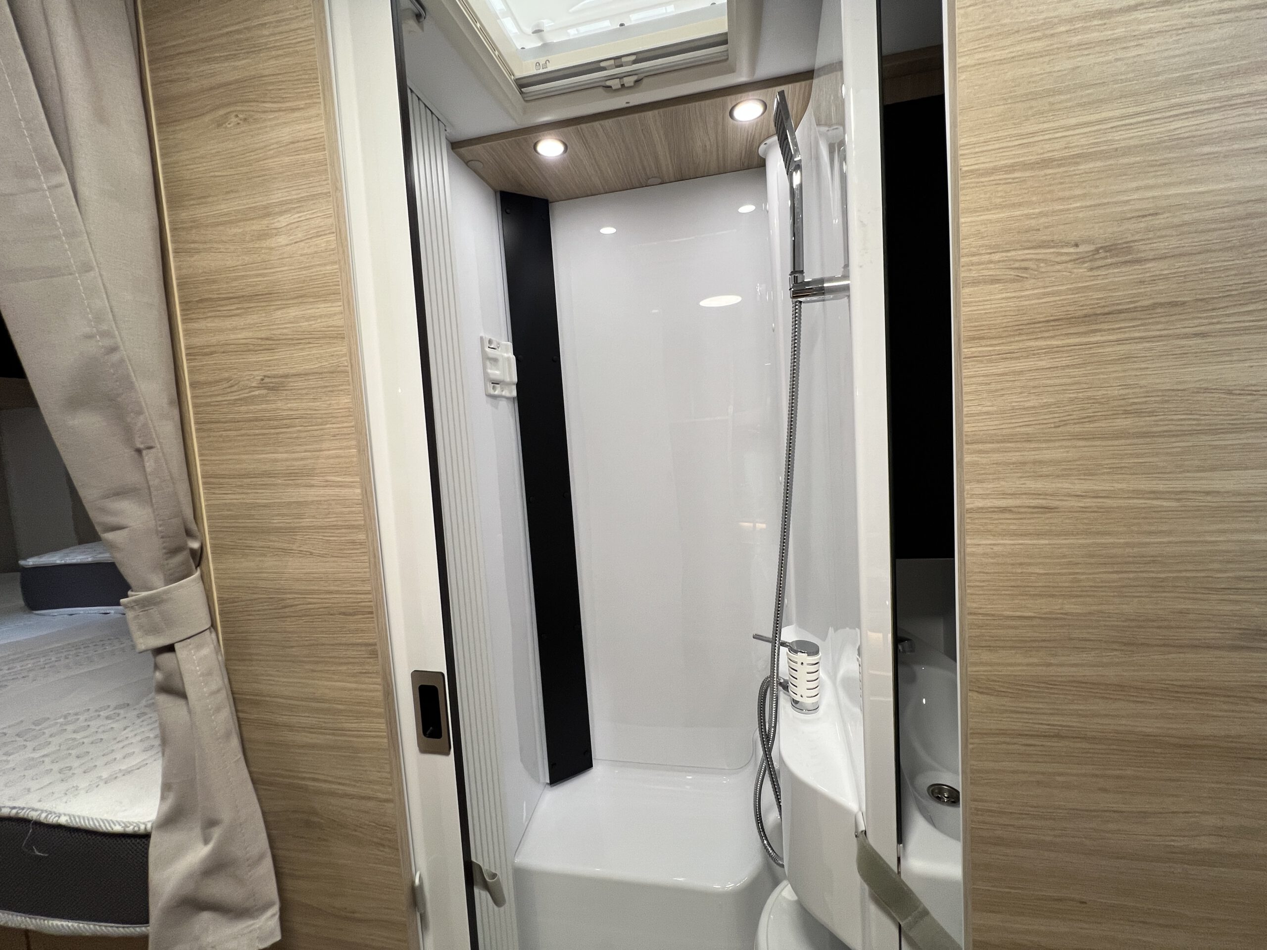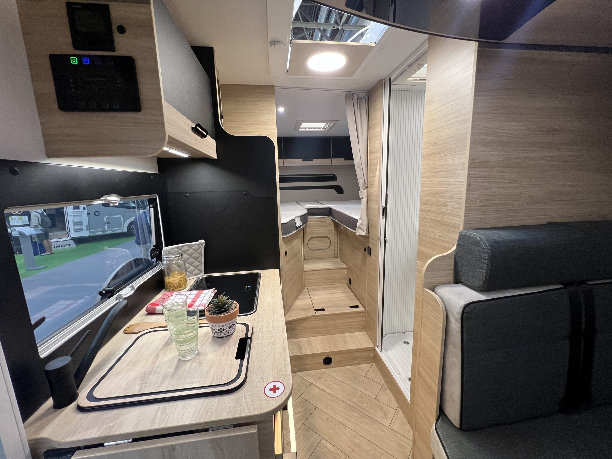 Der Chausson Titanium Line 627 hat alles an Board, um auf große Reise zu gehen. Im Innenraum findest Du Sitz- und Schlafplätze für bis zu vier Erwachsene Personen (Einzelbetten & Hubbett) und eine gut ausgestattete Küchenzeile im Fahrgastraum – inkl. Kühlschrank mit Gefrierfach. Der Fahrer- und Beifahrersitz lassen sich zur Sitzgruppe hin drehen, sodass man gemütlich am Tisch zusammen sitzen kann. Das Bad verfügt über ein Schwenkbad, äußerst praktisch! Somit hast du beim Duschen mehr Platz.